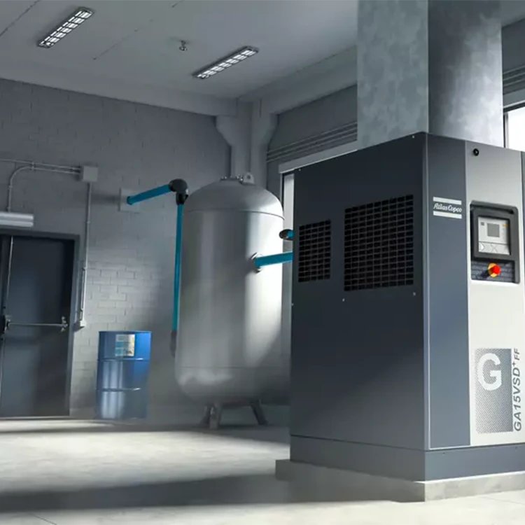 केही एयर कम्प्रेसरहरू "ट्याङ्क-माउन्ट" हुन्छन्, जसको मतलब तिनीहरू पूर्ण एकाइको रूपमा प्रदान गरिन्छ र हावा प्राप्त गर्ने ट्याङ्कीको शीर्षमा स्थापना गरिन्छ। ट्याङ्की-प्रकारको एयर कम्प्रेसरहरूको प्रयोगले ठाउँ मात्र बचत गर्दैन तर व्यक्तिगत ड्रायरहरूको स्थापनाको लागि आवश्यक प्रारम्भिक स्थापना लागत पनि घटाउँछ। यो कन्फिगरेसन सानो एयर कम्प्रेसरहरूमा धेरै सामान्य छ, र उत्पादन शक्ति सामान्यतया 26 किलोवाट (वा 35 अश्वशक्ति) भन्दा बढी हुँदैन। ठूला एयर कम्प्रेसरहरू ट्याङ्की स्थापना डिजाइनहरूका लागि उपयुक्त छैनन् किनभने यसले उच्च-भारी सेटअपको परिणाम दिन्छ, सम्भावित रूपमा सुरक्षा खतराहरू निम्त्याउँछ।
