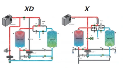 यसबाहेक, XD वा X कम्प्रेसन तातो ड्रायरहरू साँच्चै शून्य-हावा-उपभोग ड्रायरहरू हुन्, कुनै ऊर्जा खपत गर्दैन वा चिसो उड्ने चरणमा कम्प्रेस गरिएको हावाको एक अंश मात्र।