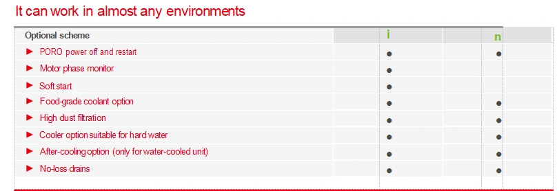 हाम्रा कम्प्रेसरहरूले फूड-ग्रेड कूलेंटहरू, उच्च धूलो निस्पंदन र कडा पानी कूलरहरू र कठोर वातावरणमा अनुकूलित अन्य विकल्पहरू प्रस्ताव गर्छन्, जसले तपाईंको बहु आवेदन आवश्यकताहरू पूरा गर्न सक्छ।