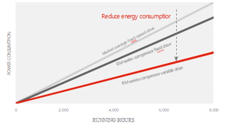 प्रत्येक RM शृङ्खलाको एयर कम्प्रेसर एकदमै नयाँ, उच्च-दक्षताको मुख्य एकाइसँग सुसज्जित छ, जसमा IE3 फिक्स-स्पीड मोटर र ECO*-PM VSD IE5 चर-फ्रिक्वेन्सी मोटर प्रविधिको संयोजन छ, जसले तपाईंलाई ऊर्जा लागतमा १२-३०% बचत गर्न मद्दत गर्छ।