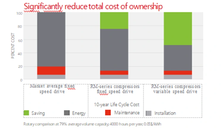 हामीले नयाँ RM शृङ्खलालाई अत्याधुनिक कम्प्रेसर इकाइहरू प्रयोग गरेर विकास गरेका छौं, तपाईंलाई उत्कृष्ट प्रदर्शन प्रदान गर्न डिजाइन गरिएको हो। अनुकूलित रोटर प्रोफाइलहरू र अन्य सुधारहरू मार्फत, नयाँ कम्प्रेसर एकाइले दक्षतामा 11% वृद्धि र सञ्चालन लागतहरूमा महत्त्वपूर्ण कमी प्राप्त गर्दछ। यसबाहेक, नयाँ रोटर प्रोफाइलले आदर्श हावा क्षमता प्राप्त गर्दछ, अघिल्लो पुस्ताको तुलनामा 11% बढी। कम पावर-टू-वेट अनुपात भनेको कम उपकरण लगानी लागत र ऊर्जा खपत हो, जसले गर्दा तपाईंको स्वामित्वको कुल लागत घटाउँछ।